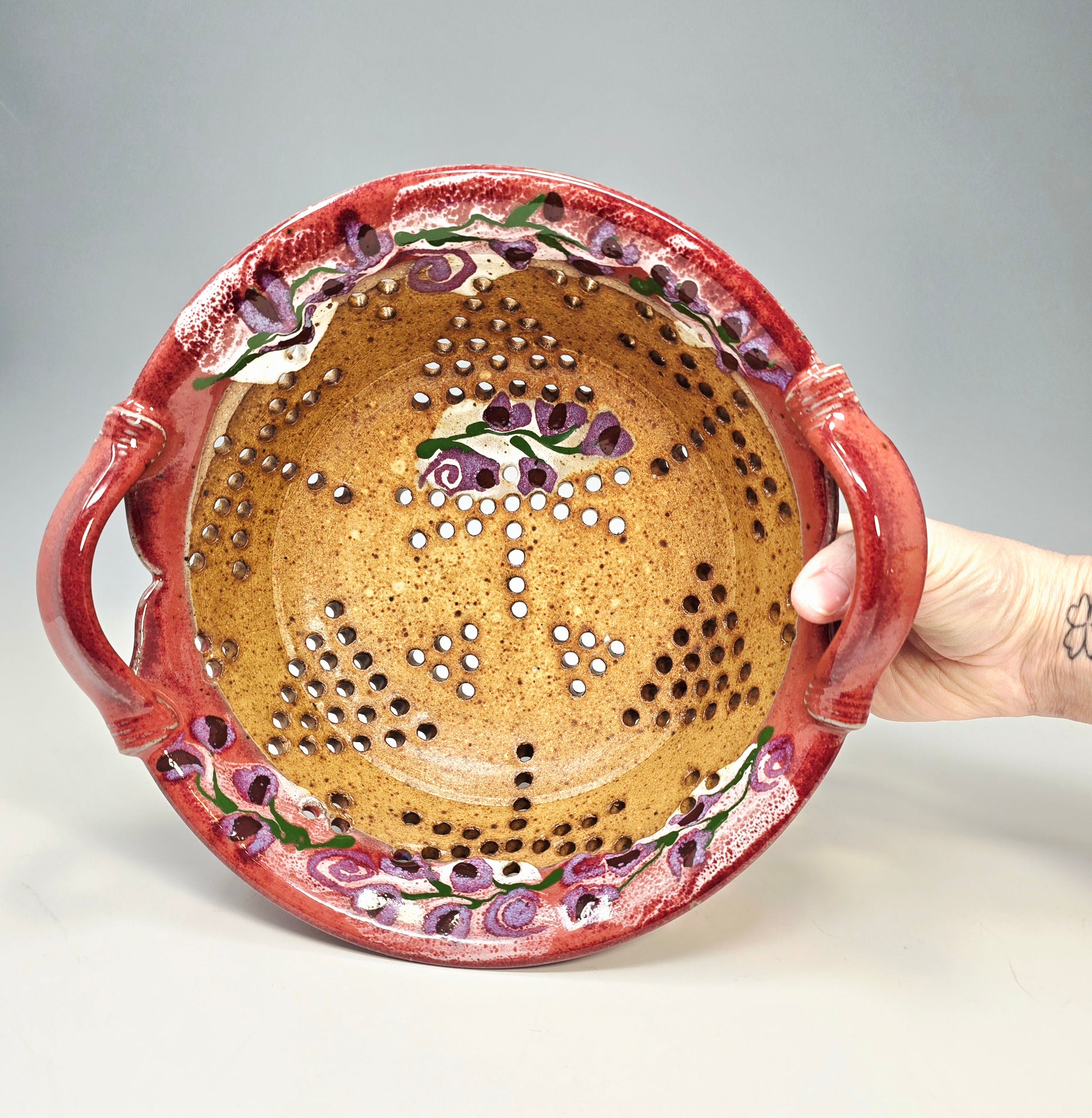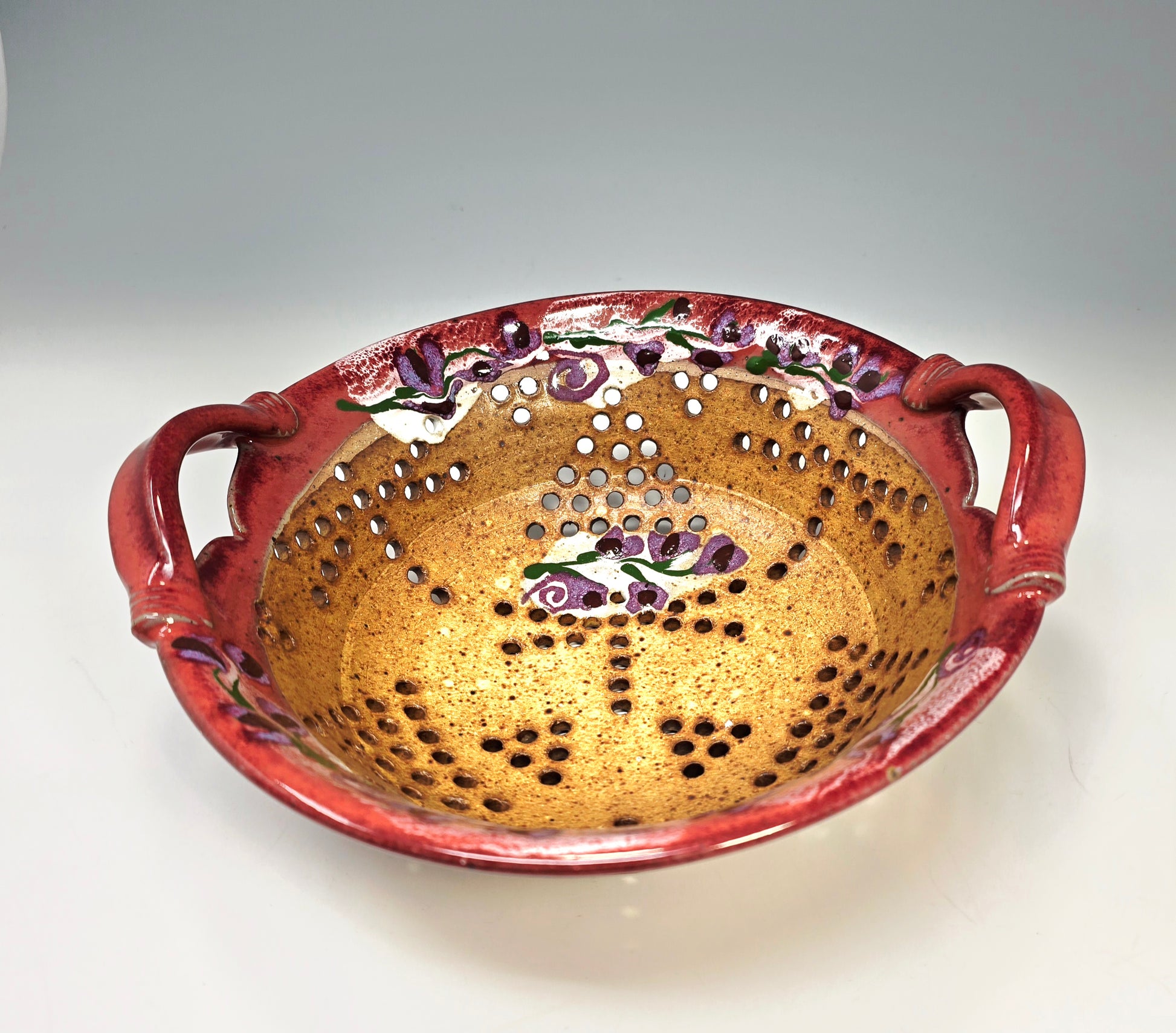 This luscious pumpkin orange with a red rim berry colander/ basket is the perfect daily choice for rinsing and aerating fruits and vegetables. My signature dragonfly appears in the pattern of the holes! I love my grapes and cherry tomatoes in this bowl, but lemons, avocados and tangerines need air too. My most popular item, berry bowls make a great gift.