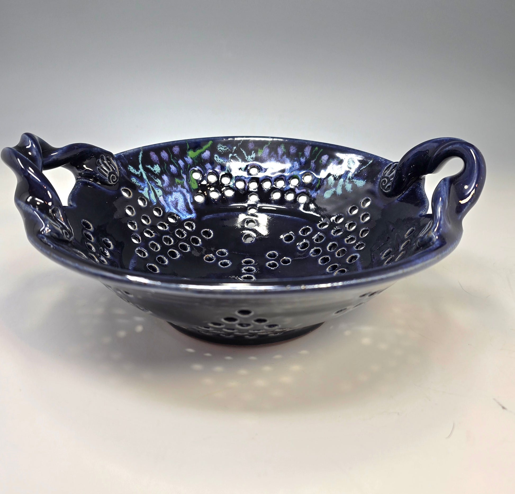 This rich cobalt blue berry colander has fun twisty handles and is the perfect daily choice for rinsing and aerating fruits and vegetables. My signature dragonfly appears in the pattern of the holes! I love my grapes and cherry tomatoes in this bowl, but lemons, avocados and tangerines need air too. My most popular item, berry bowls make a great gift.