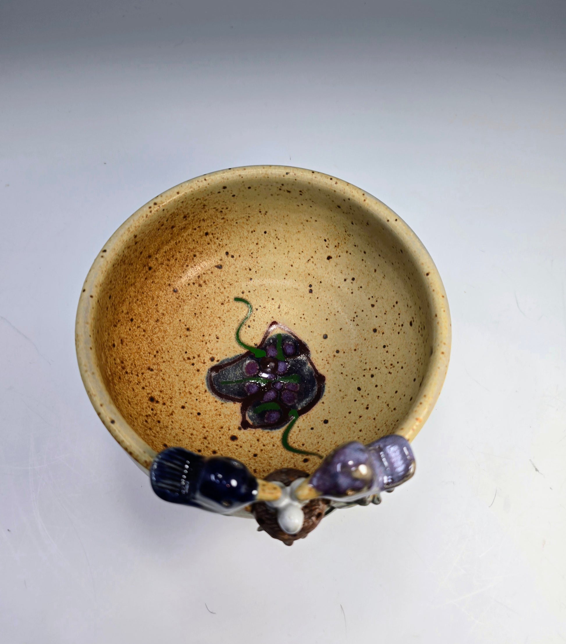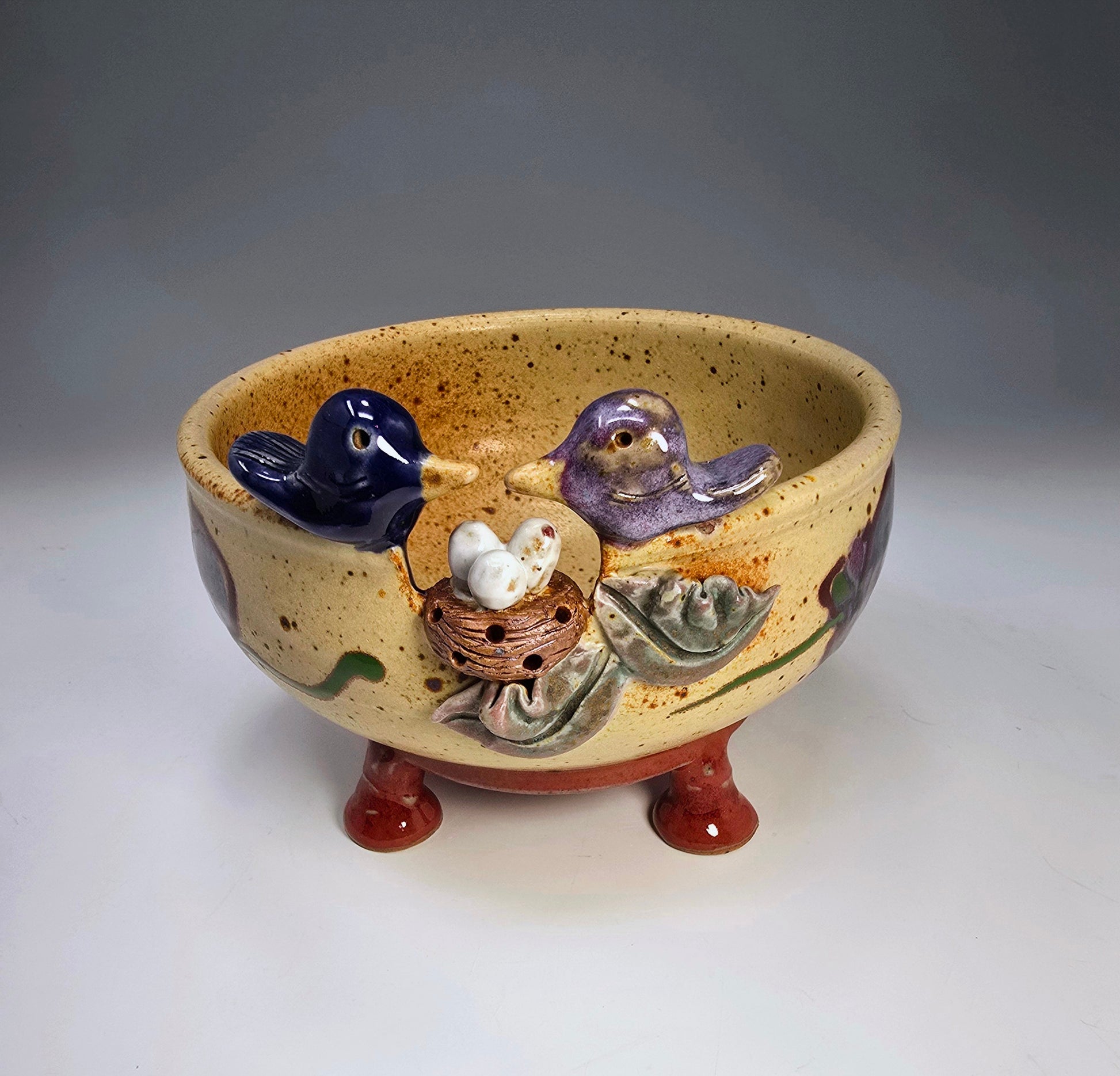 This awesome tan bowl with 4 cute red feet is truly one of a kind. 2 adorable birds sit near their nest as leaves cascade down the side. Quite the conversation piece, I made this to be used as a serving bowl for dips, vegetables and all your other dishes. Don't you just love the way the feet raise it up off the table adding such character!