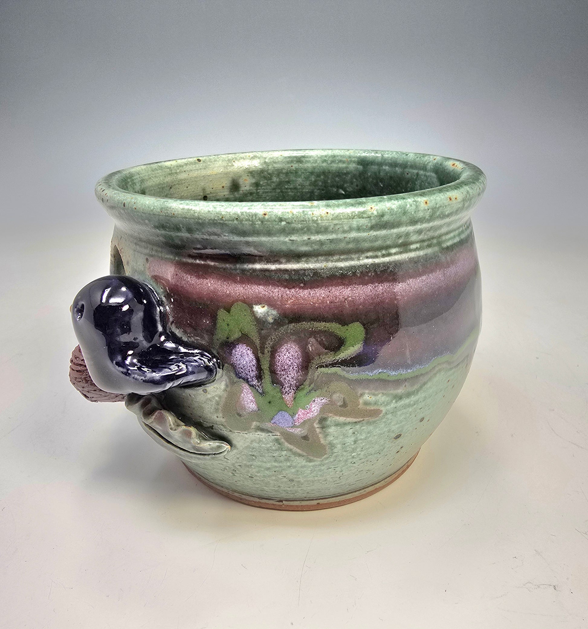 This charming little green cup features a bluebird on her nest of two eggs, in an open window. Its perfect for fresh flowers! Fantastic table or desk decor, great for a votive candle or just a paperweight. A fun little gift!