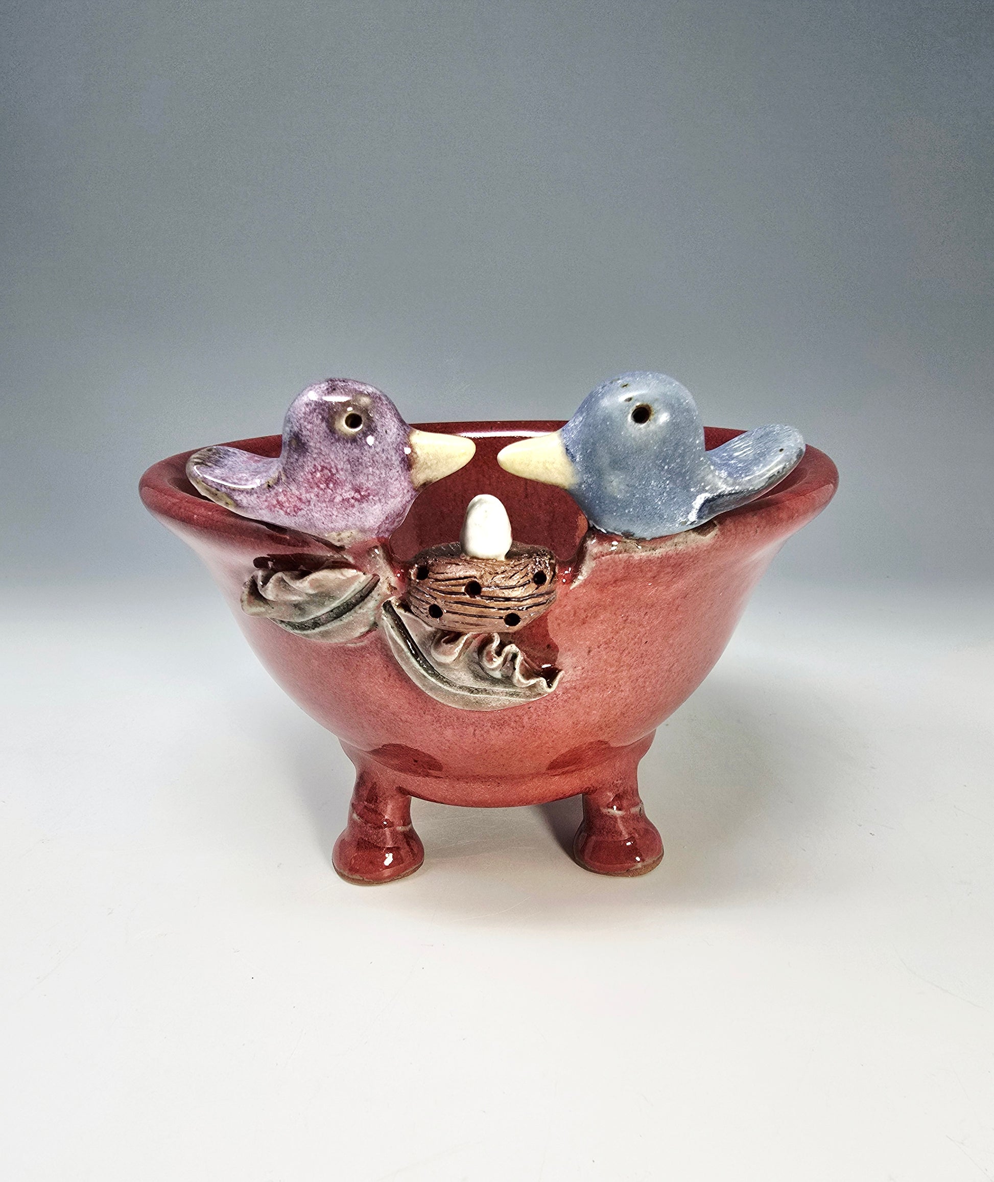 This awesome bright Chinese copper red bird bowl with 4 cute cobalt blue feet is truly one of a kind. 2 adorable lovebirds sit near their nest with 1 little egg inside as leaves cascade down the bowl. Quite the conversation piece, I made this to be used as a serving bowl for dips, vegetables and all your other dishes. Don't you just love the way the feet raise it up off the table adding such character!
