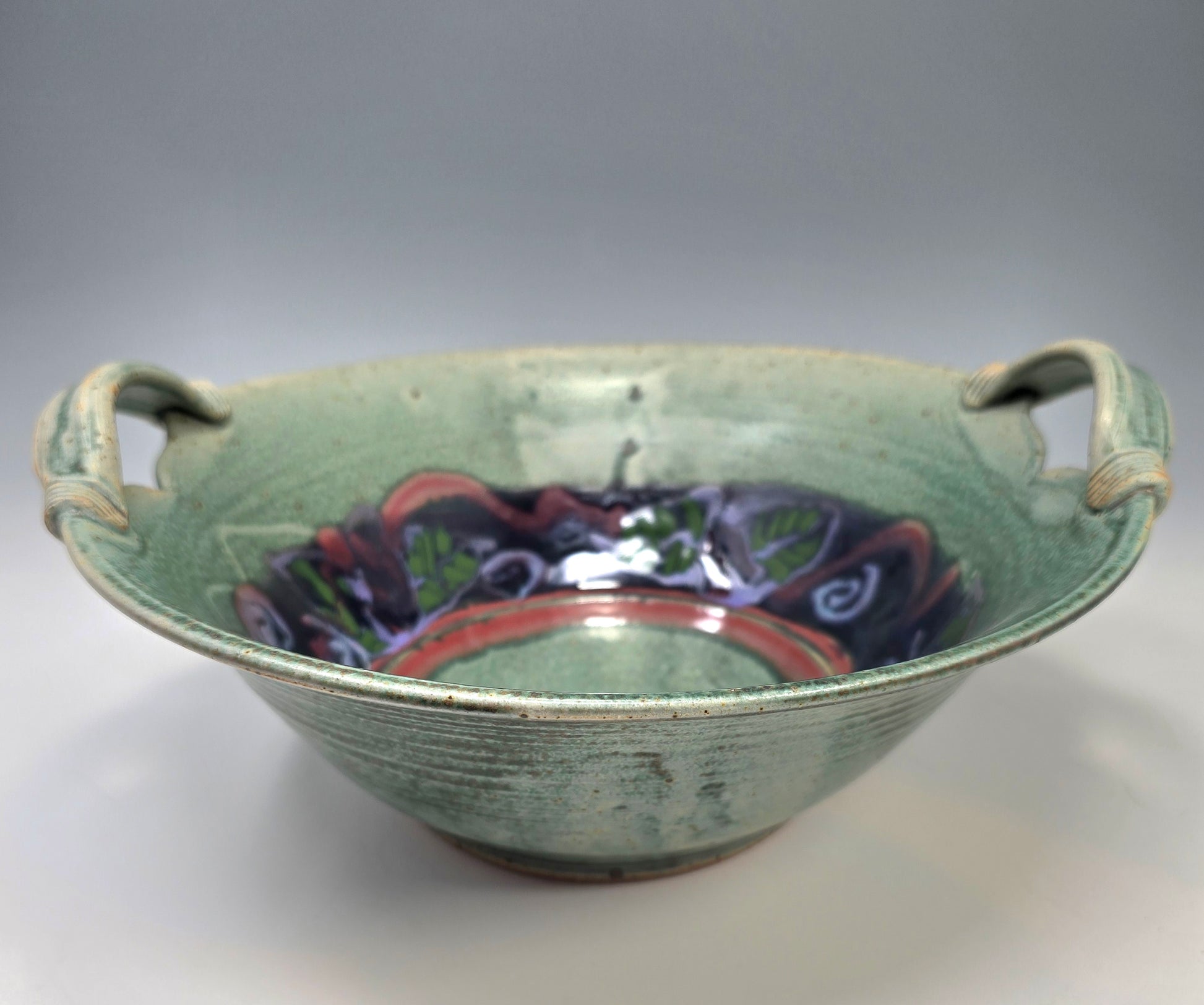 This big green serving bowl is enhanced by a lovely blue and purple flower designs inside. Perfect for serving both hot and cold dishes, I use mine everyday for salads. The handles are sturdy and the piece is lightweight so its easy to use!