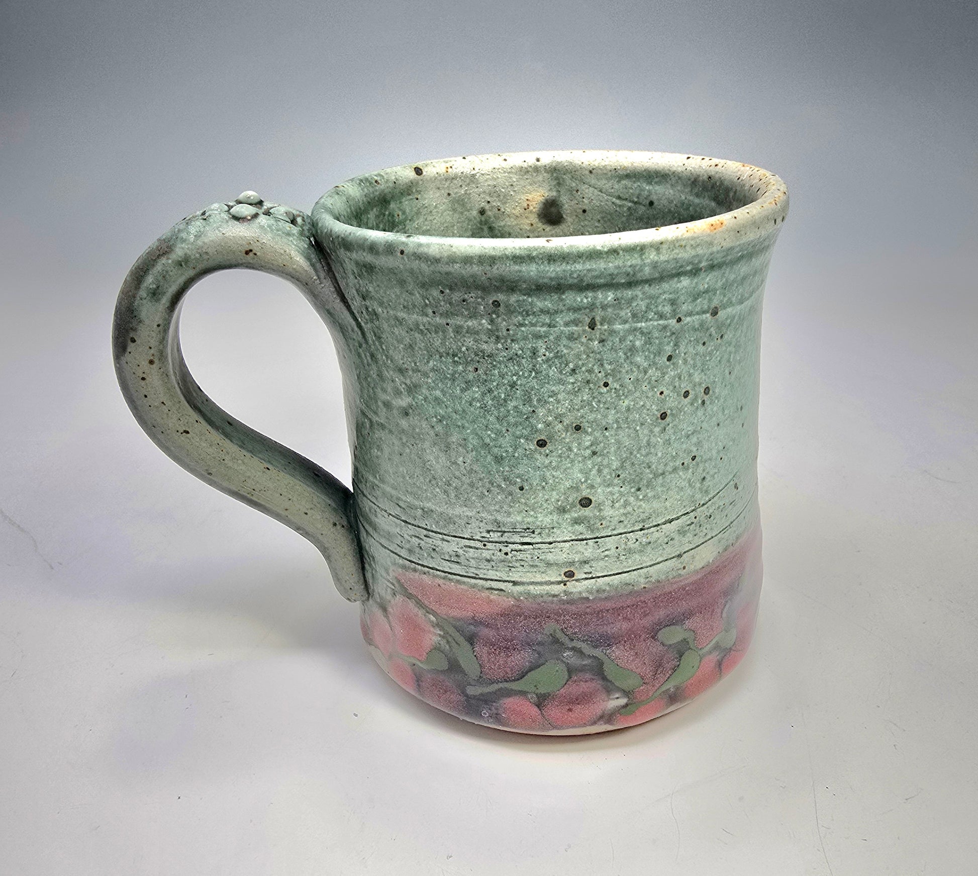 This is a listing for one single 10 ounce coffee or tea mug in a beautiful green glaze with accents of purple and blue. The handle is unique. It has my signature "high five" hand-stamp at the base and a cute pigtail on the side. There is a sweet handle grip consisting of pleasing raised bumps at the top of the handle. Treat yourself to this versatile cup every day! Or buy a whole set by custom order!