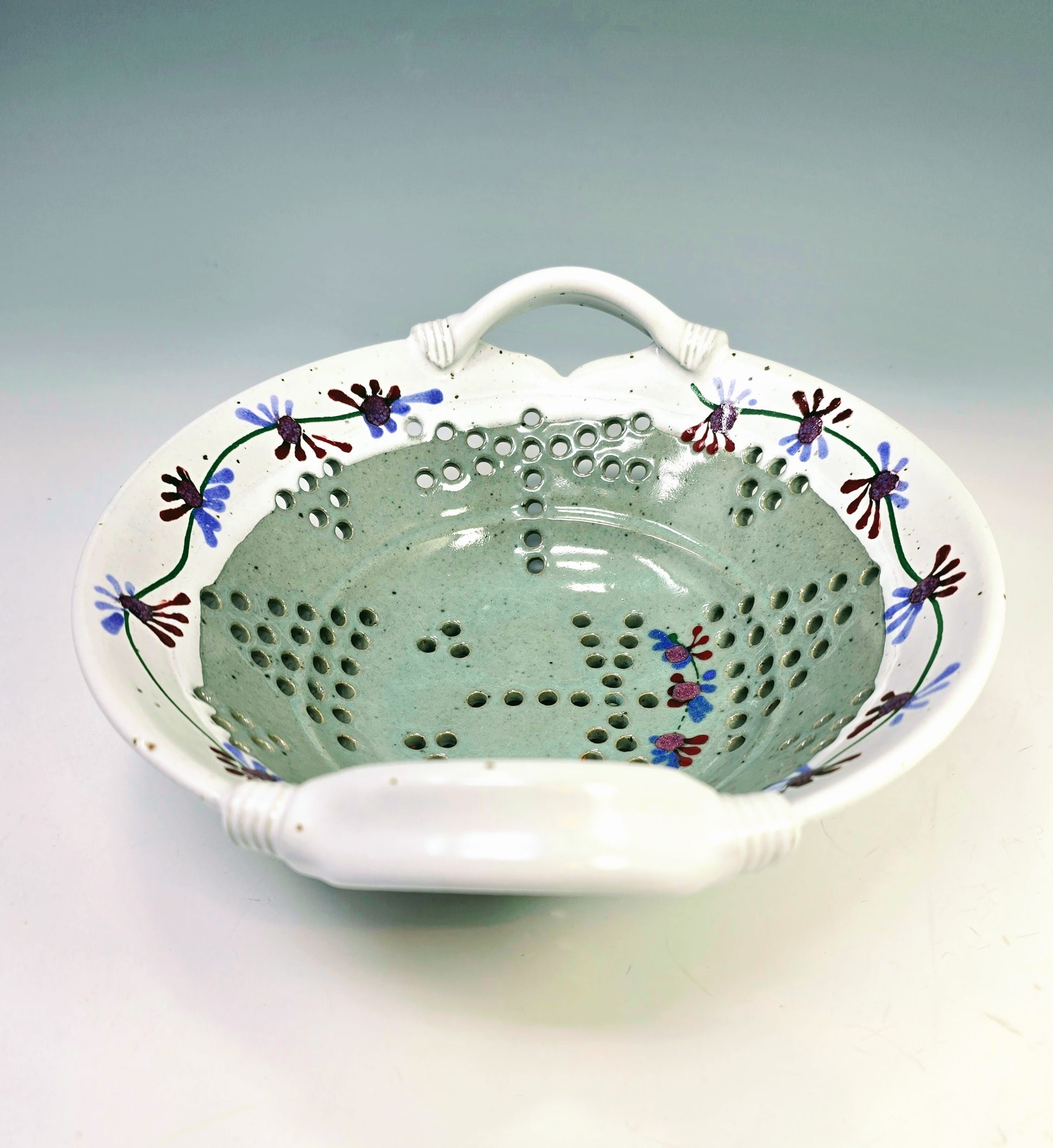 This colander or berry bowl is clean white rim on a green base with a lovely decoration inside and out. It is the perfect daily choice for rinsing and aerating fruits and vegetables. My signature dragonfly appears in the pattern of the holes! I love my cherry tomatoes in this bowl, but lemons, avocados and tangerines need air too. My most popular item, berry bowls make a great gift.