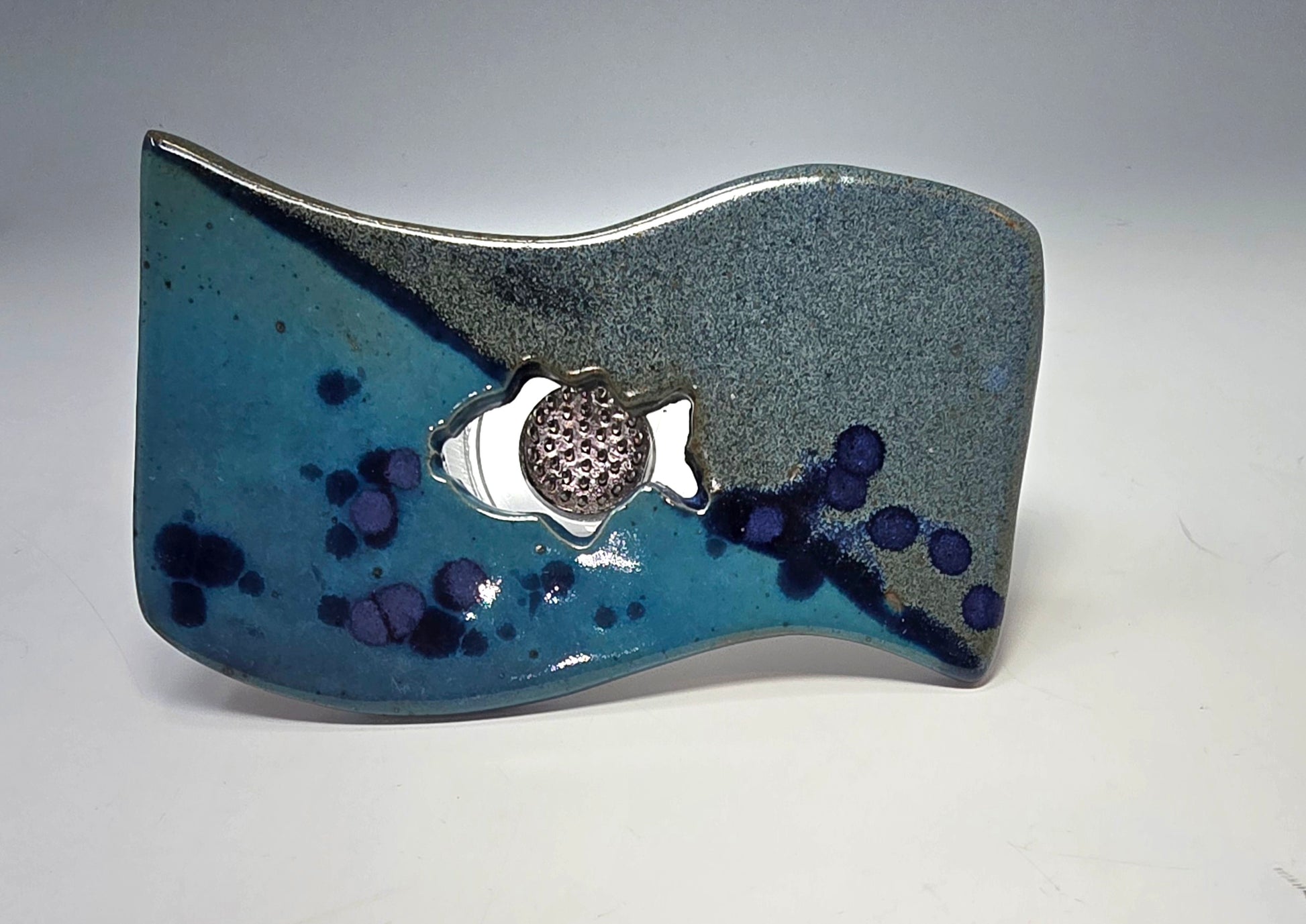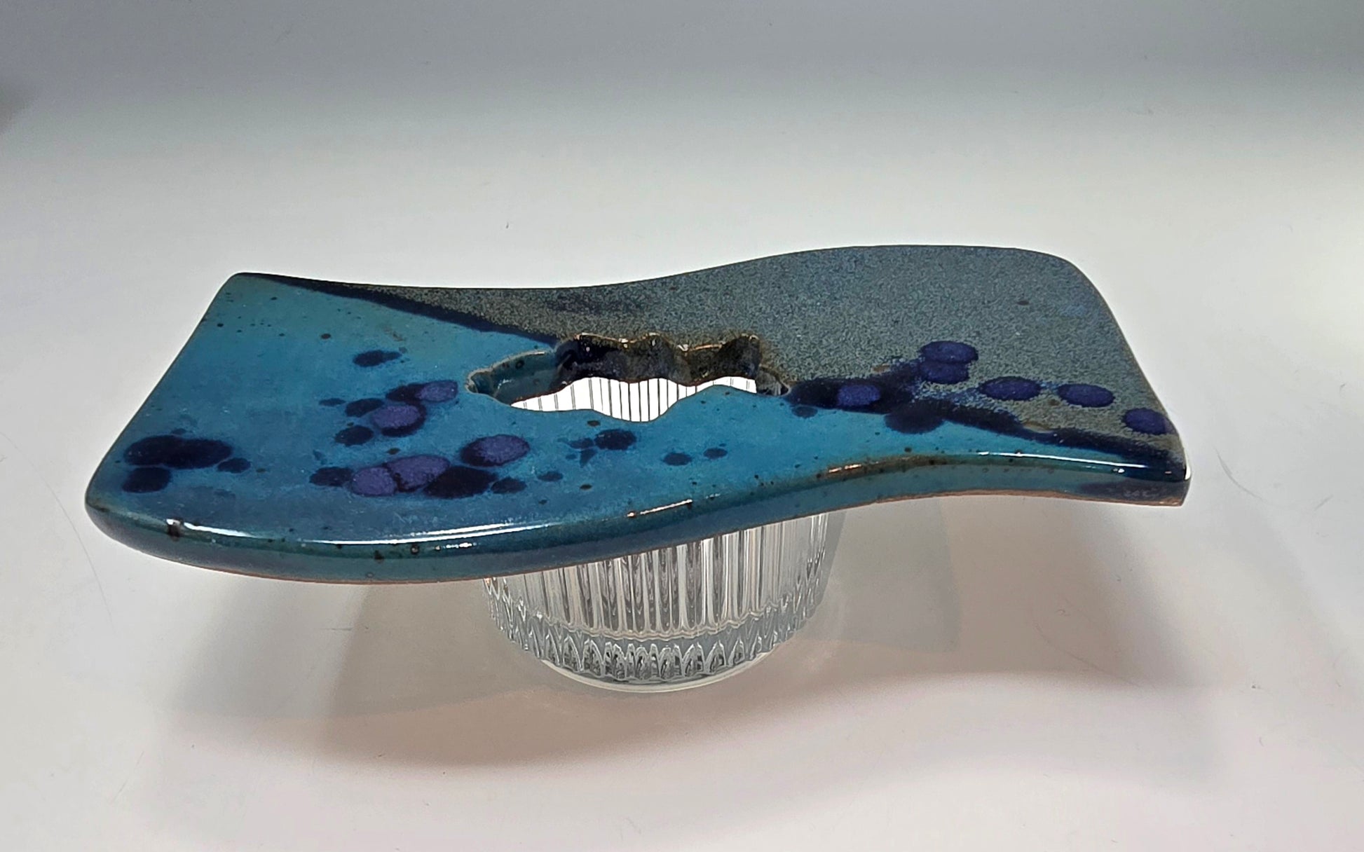 This lovely flower frog vase is a fun wave shape. The teal and black color has a lovely pattern on the side. The center hole is a cute fish shape. It makes a great hostess gift and fits so well on the kitchen windowsill. It measures 5.25" long and 2.5" wide and stands 1.5" tall.