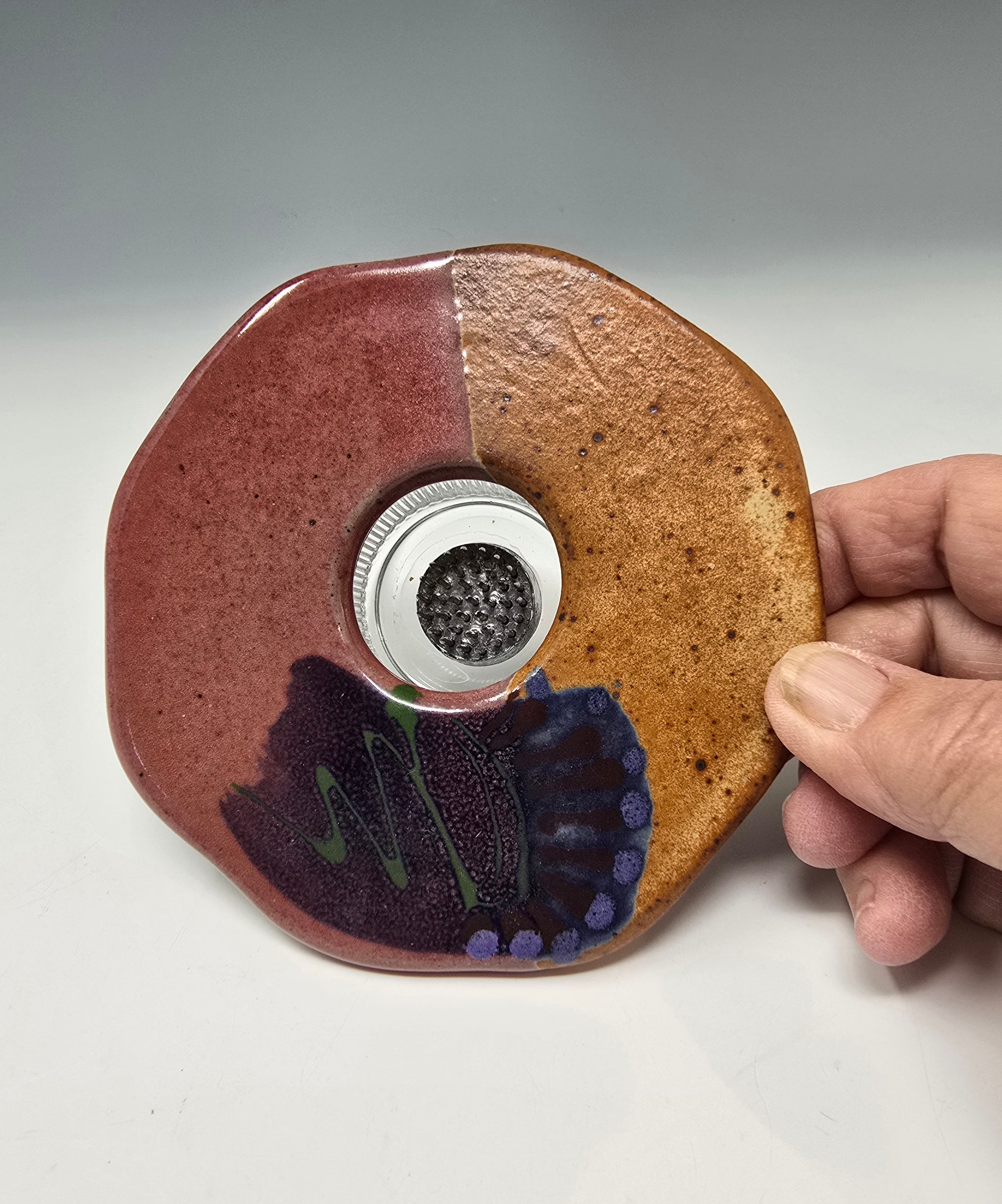 This is a cute octagon shaped vase is warm pumpkin and red glazed with fun blue patterns. It measures 4" long, 4" wide and stands 1.5" tall.