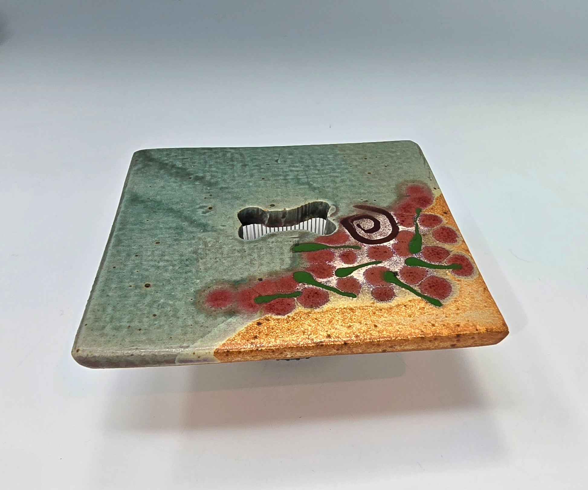 This lovely flower frog vase is a fun square shape. It has a green and tan base with a cute dog bone in the middle of the square flower opening . I love the stamped and painted swirls! It makes a great hostess gift and fits so well on the kitchen windowsill. It measures 4" wide and stands 1.5" tall. Think wedding tables!