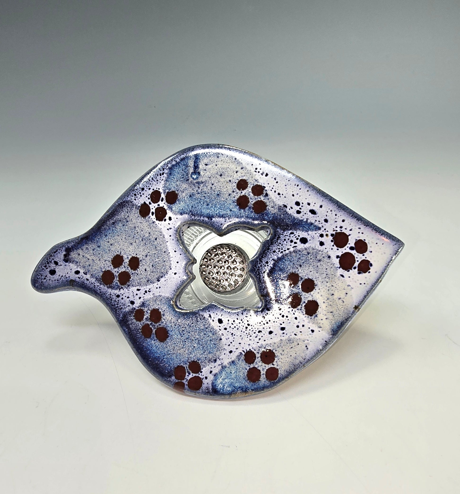 This lovely speckled blue and white flower frog vase is a leaf shape and has a cute butterfly cutout in the middle and patterns all around. It makes a great hostess gift and fits so well on the kitchen windowsill. It measures 4" wide, 5.5" long and stands 1.5" tall.
