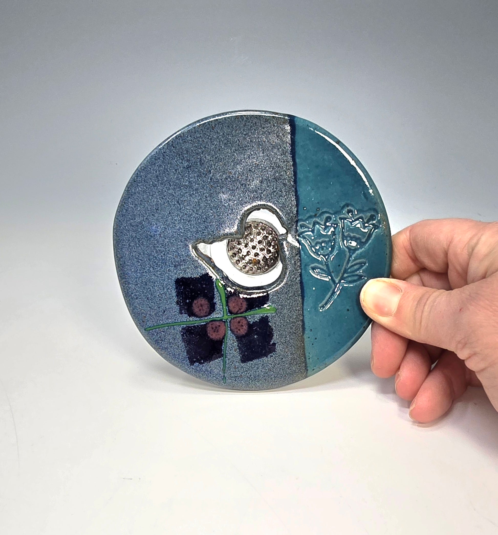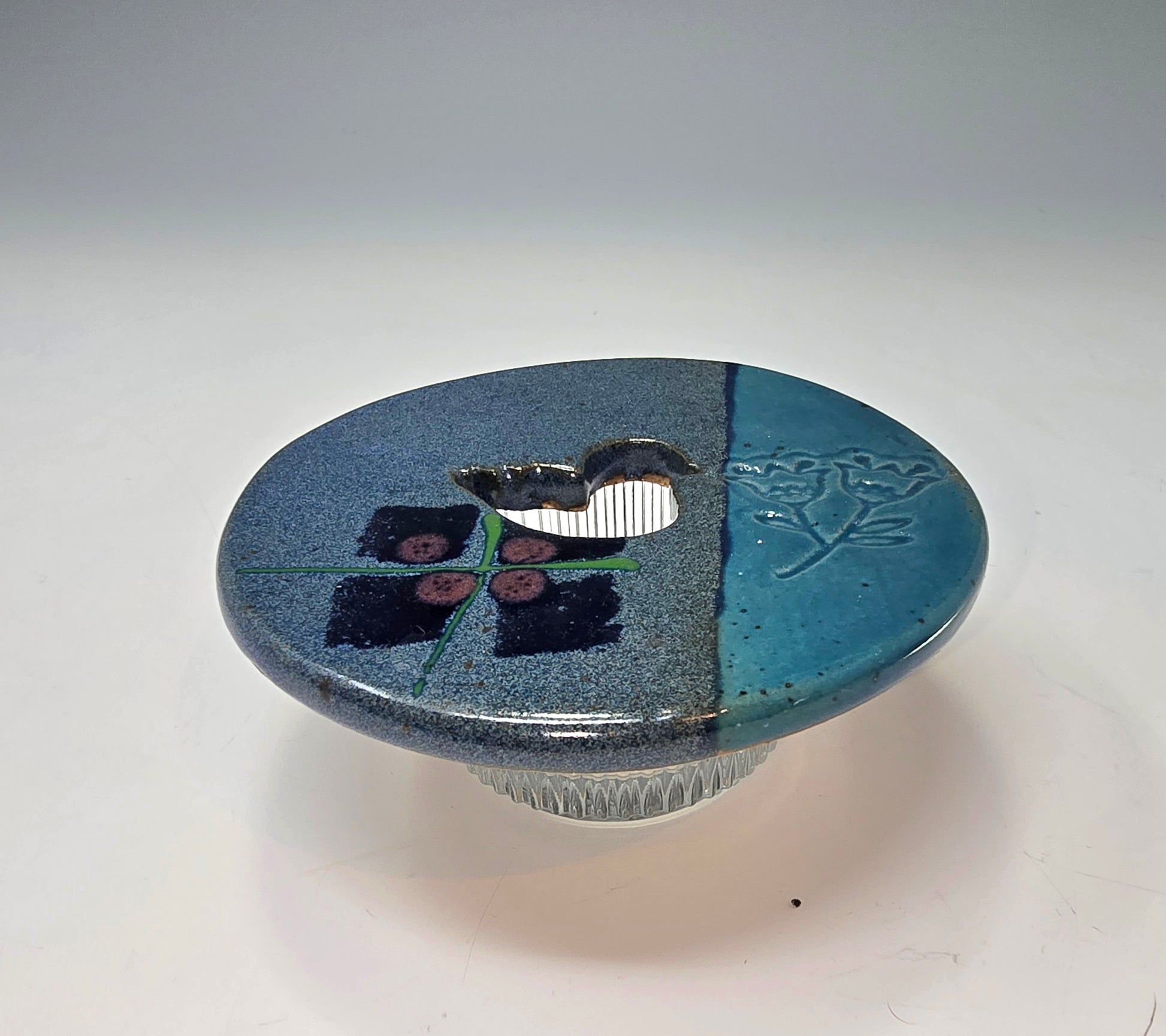 This is a cute round shaped vase is lovely teal and blue color with fun duck and flower stamp. It measures 4" long, 4" wide and stands 1.5" tall.