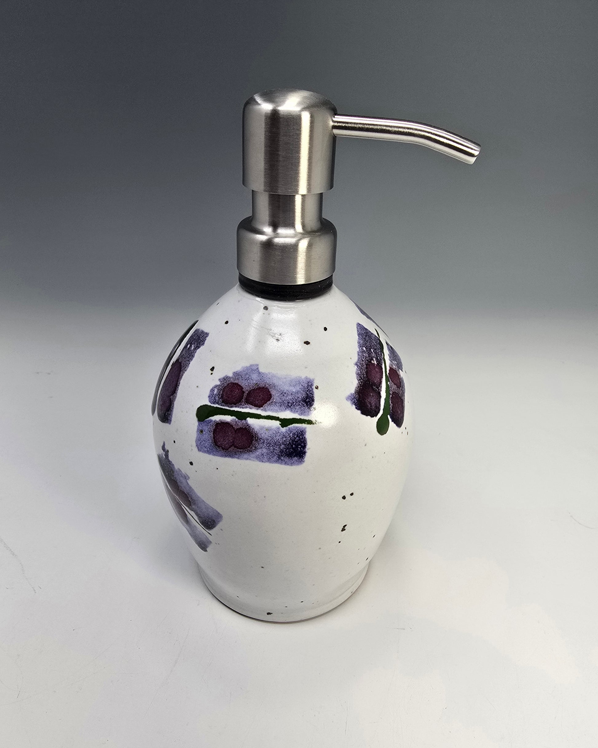 This is an awesome crisp modern white with blue patterns. It's a refillable soap or lotion dispenser with a stainless steel pump top included. A perfect gift for the kitchen or bathroom. Made of high fired stoneware, this cute accessory is fully washable and will not leak. You'll enjoy it for years to come.