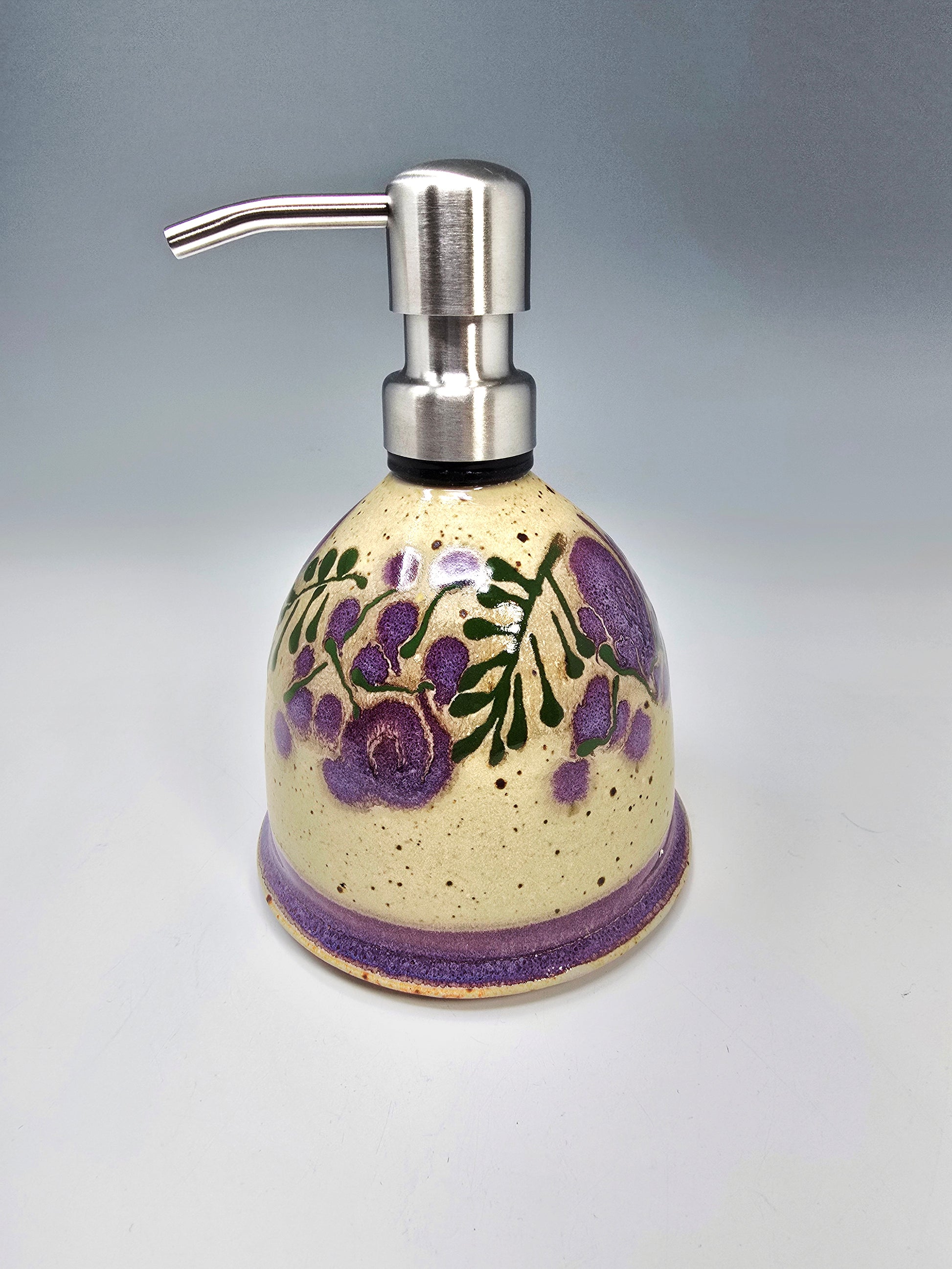 This is a beautiful shade of warm tan with pretty green and purple patterns. It's a refillable soap or lotion dispenser with a stainless steel pump top included. A perfect gift for the kitchen or bathroom. Made of high fired stoneware, this cute accessory is fully washable and will not leak. You'll enjoy it for years to come.
