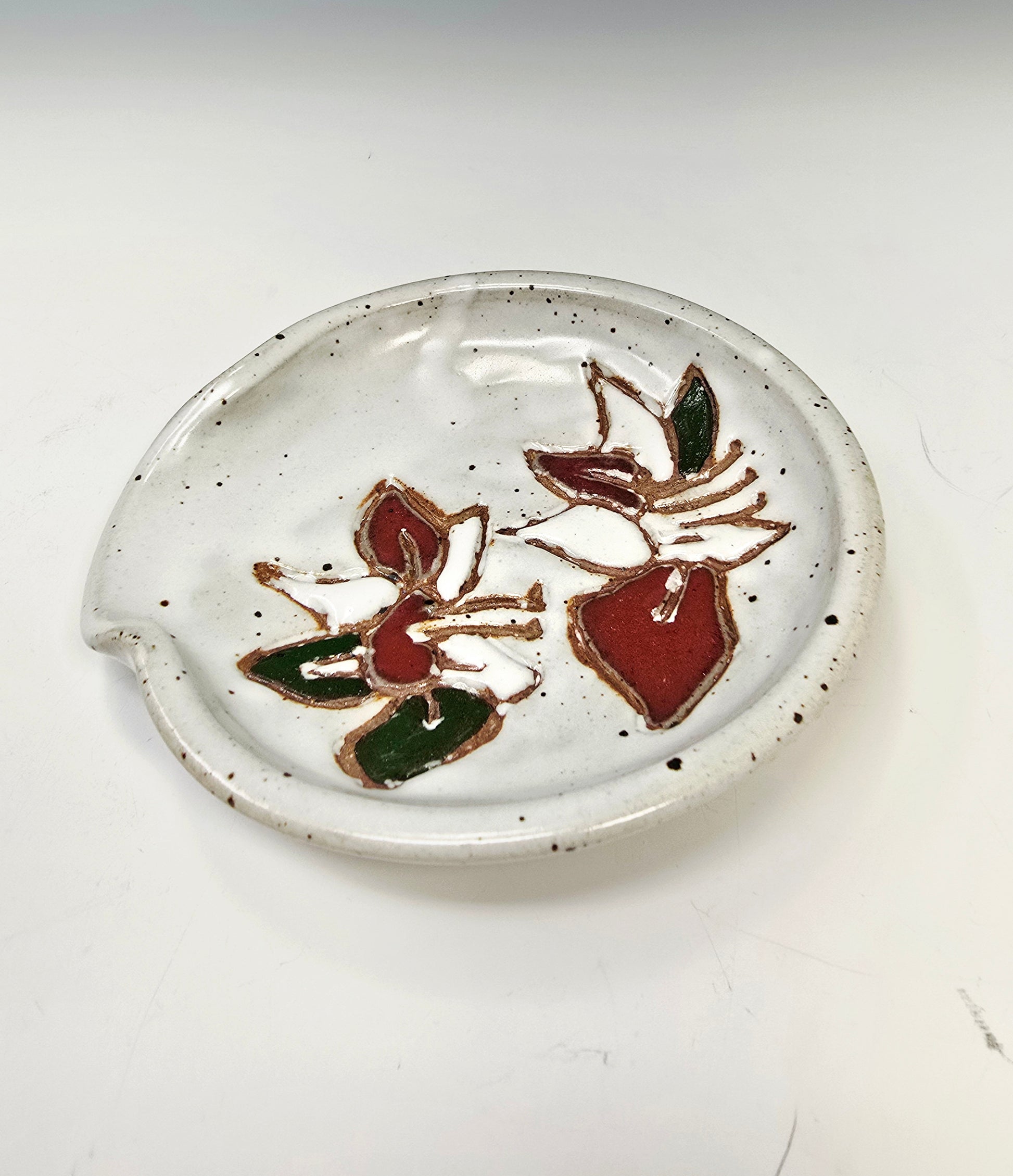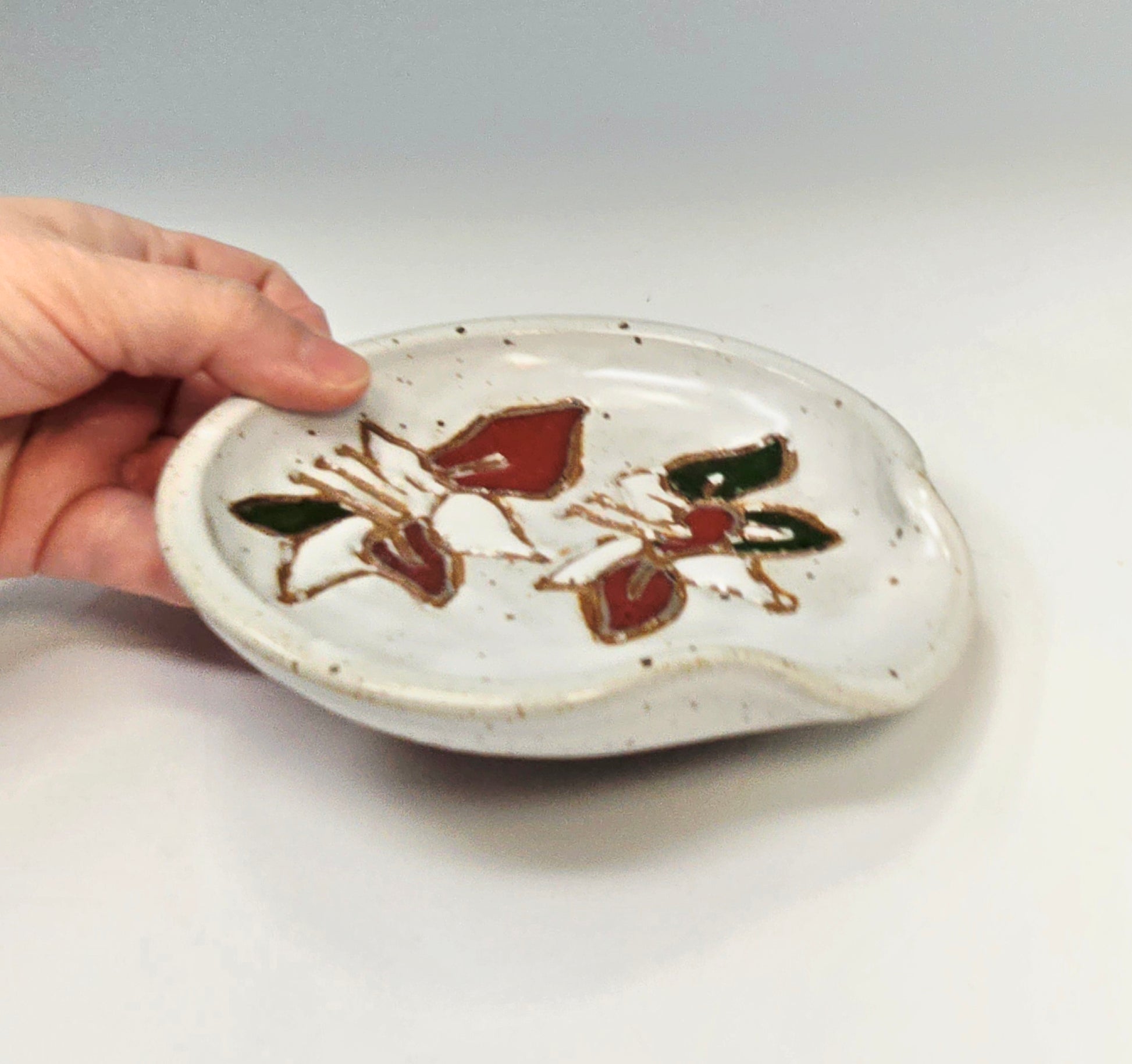 This is an adorable stoneware spoon rest in white with lovely carved designs. Its flat on one end and curvy on the rest. It will hold all sizes of spoons. A lovely sturdy stovetop accessory! My new Italian influence shows in all the carved and hand painted details!