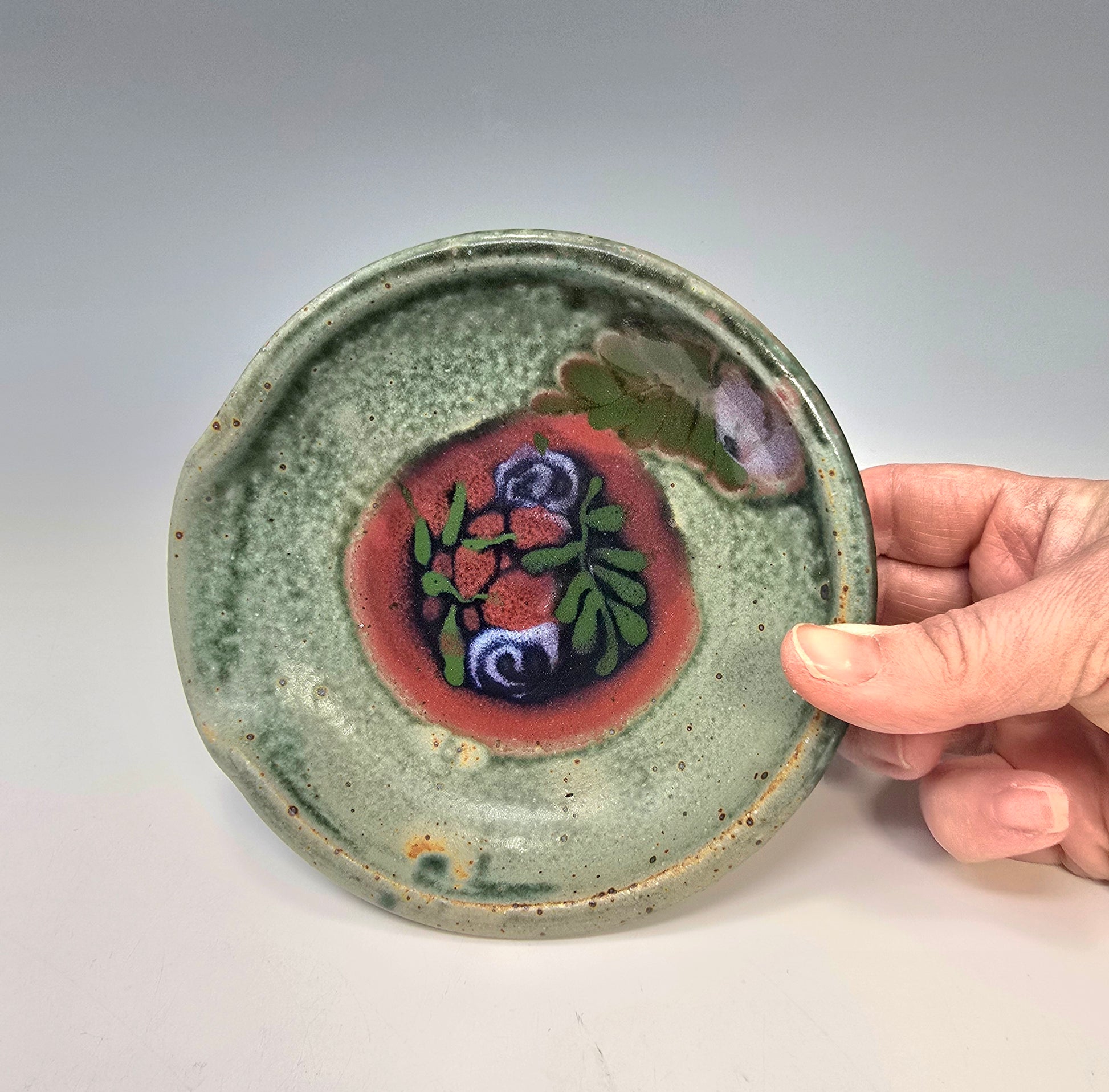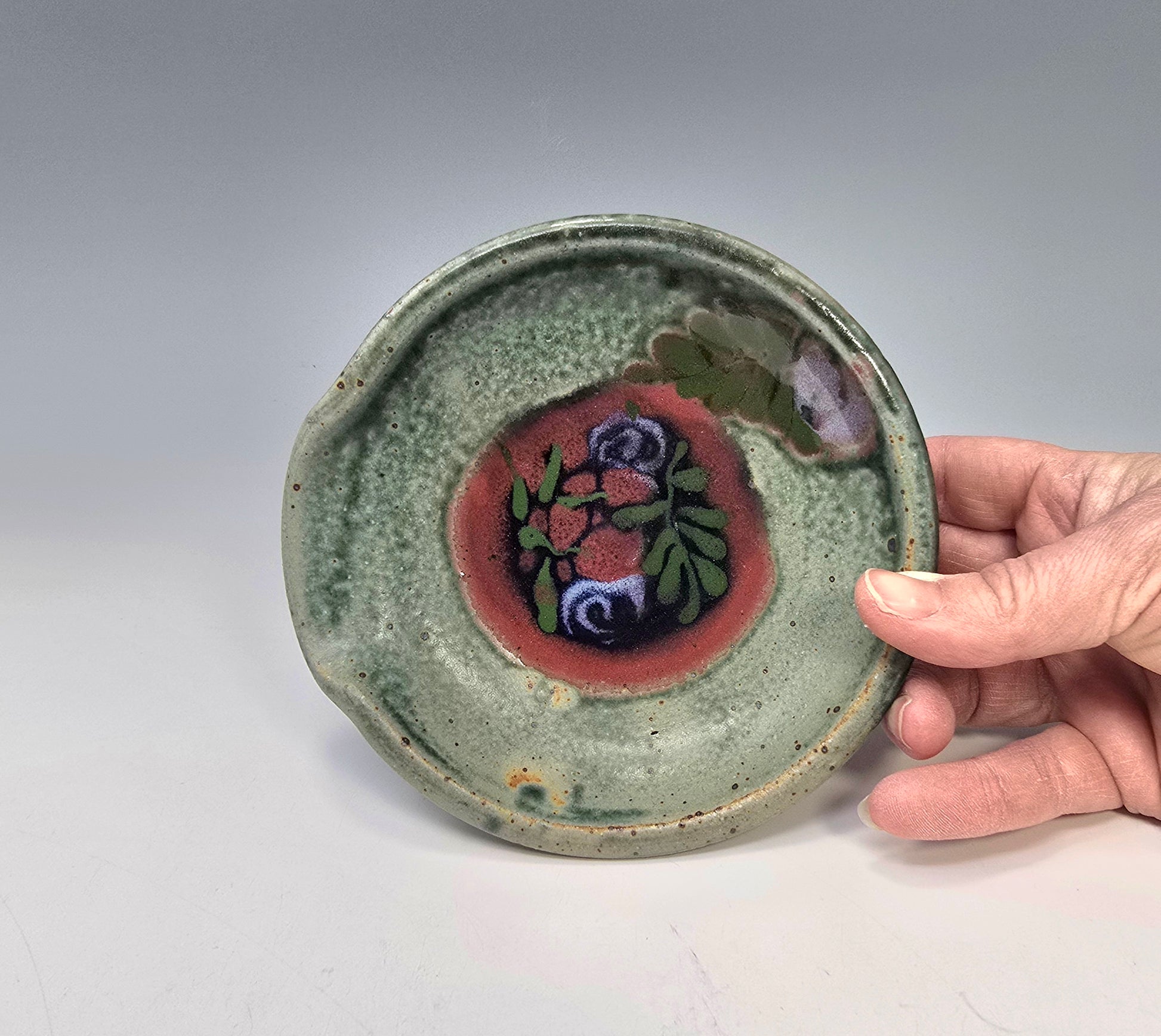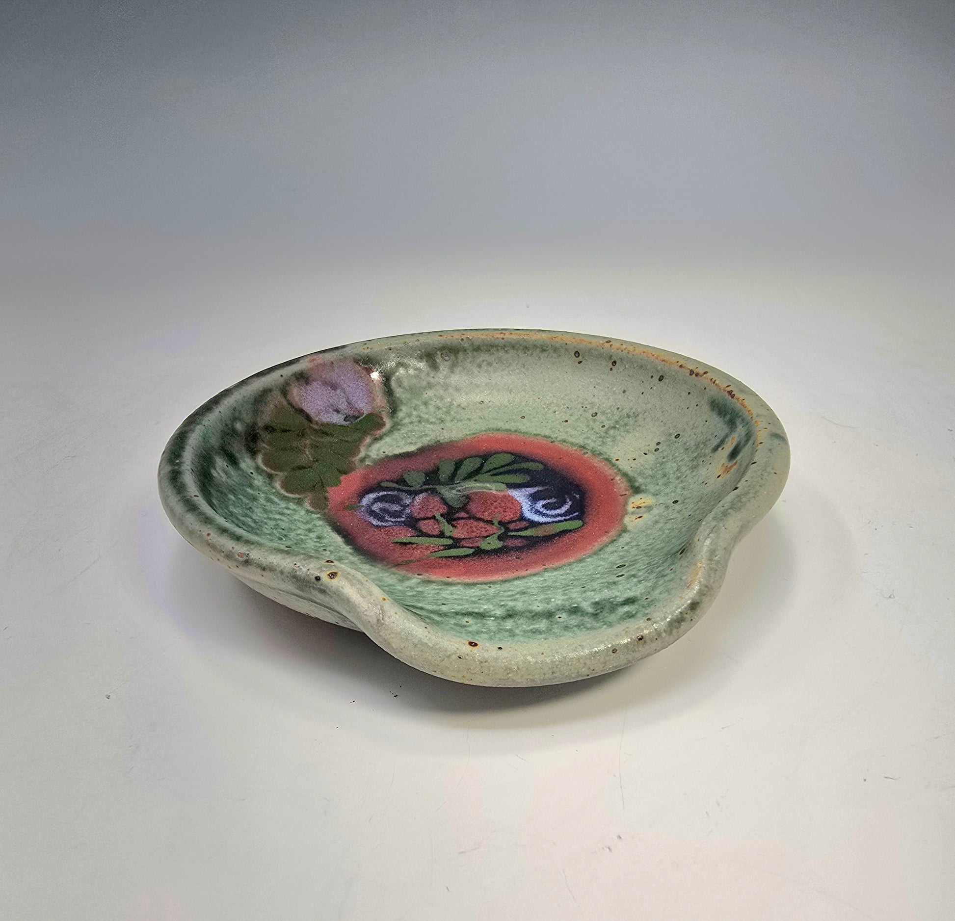 This is an adorable stoneware spoon rest in rich speckly green with lovely designs. Its flat on one end and curvy on the rest. It will hold all sizes of spoons. A lovely sturdy stovetop accessory!